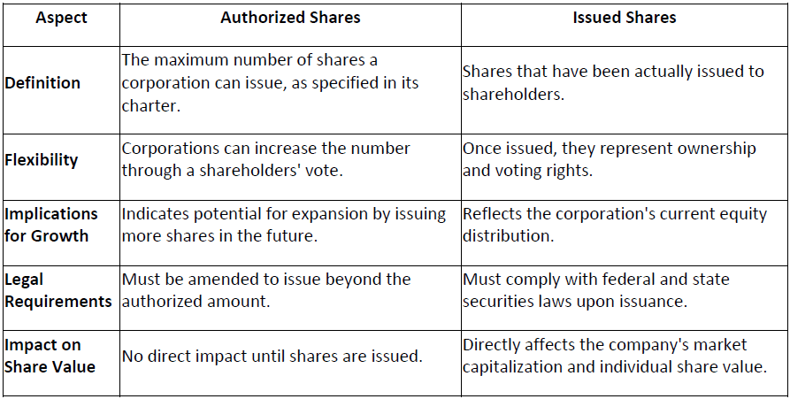 A Table Showing the Differences and Implications for Corporate Growth of Authorized Shares vs. Issued Shares